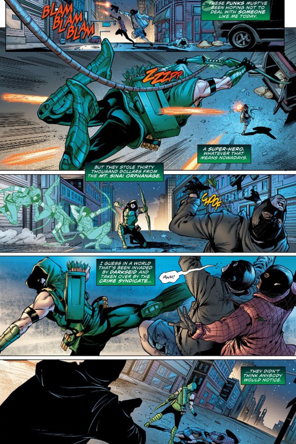 While fans may quibble about the changes in the book’s cast, few will argue that the book hasn’t traded one fine art team for another. Daniel Sampere and Jonathan Glapion – most recently seen working together on Batgirl – bring a more traditional comic-book style to Green Arrow than the experimental Andrea Sorrentino. In this case, however, traditional works. The action sequences are all well choreographed, the splash pages are all poster-worthy, and even the scenes where the characters just talk are full of a subtle, dynamic action.
