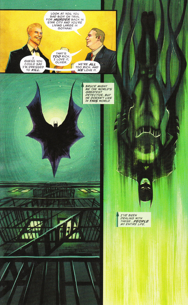This yields a golden opportunity for Oliver Queen – flaunting his freedom while being out-on-bond and out-of-state while awaiting murder charges – to hob-knob with the fat-cats. That, in turn, leads to an encounter with The Court of Owls… and The Batman.