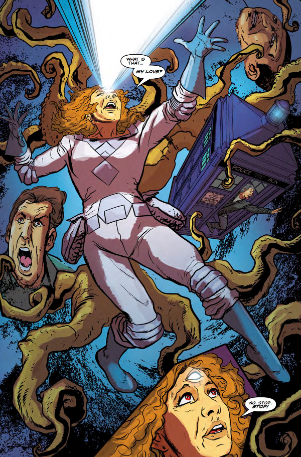 Ribero redeems himself in the later chapter focused on Jenny, The Doctor’s Daughter, which features some fantastic color-work. Despite being drawn by four different artists, the artwork here has a more unified look and better story-flow than the section solely illustrated by Ivan Rodriguez. Once again, Emma Beeby does a fantastic job capturing the main character’s voice as we learn what happened to Jenny between her last appearance on the Doctor Who television program and her first appearance in the comics in Doctor Who: The Lost Dimension Alpha.