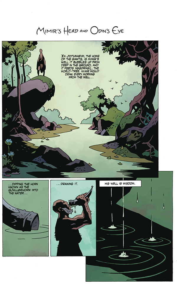 This first issue features two complete stories and the first part of a third. The first, Yggdrasil And The Nine Worlds, details the cosmology of Norse mythology and the nine realms contained in the world tree. Russell illustrates this one with his usual keen eye for detail, which will be well familiar to those who know his work on Sandman. A darker tale is told in Mimir’s Head and Odin’s Eye and is appropriately illustrated by Hellboy creator Mike Mignola. The color art for both stories perfectly partners with the tales, as Lovern Kindzierski wields a variety of palettes in depicting everything from Asgard to Hel and back. Dave Stewart goes darker in his coloring of the story of how Odin lost an eye to gain the wisdom of a magic well.