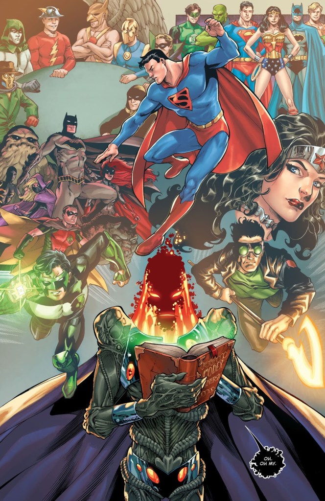 Glib though it may be for me to summarize it that way, it’s impossible to take away any other interpretation of James Tynion IV’s script, particularly when paired with the magnificent splash page above assembled by Jesus Merino, Vicente Cifuentes and Ulises Arreola. Here we see many of the stories that have been cast into the winds of Hypertime by editorial fiat in recent years; the original Justice Society of America, the Justice League with Martian Manhunter, the classic Superman and modern age Wonder Woman… even more recent legends such as Kyle Rayner, The Last Green Lantern and Starman Jack Knight. There’s also, tellingly, the Belfry team from Tynion’s all too brief run on Detective Comics in the Rebirth era.