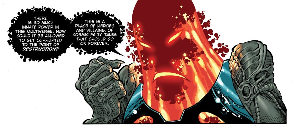 Tynion’s intent is clear. He does not slight the modern era of DC Comics itself. Rather, he mocks the idea that cosmic events are the alpha and omega of comic books. Despite what various powers believe, the vast majority of comic readers turn to stories such as these to read about people. People in costumes with superpowers, but people nonetheless. And to borrow a phrase from Mark Waid, everything falls apart “the minute you made the super more important than the man.”