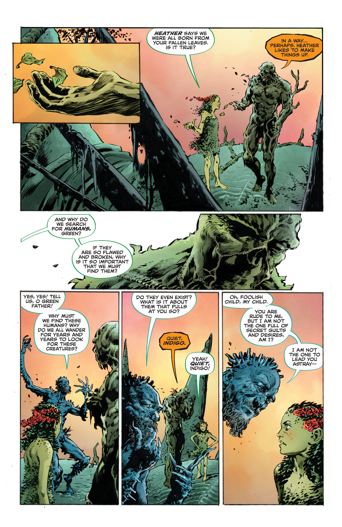 In the opening pages, Swamp Thing regales his daughter Calla with the story. “Will you tell me again what happened to the world that was?” As a father always does, he humors his child and drops a bit of exposition upon us. It seems that as humans developed in technological prowess as well as meta abilities they perfected their violence to the point that the entire world was endangered. Maintaining the balance would no longer suffice, and Swamp Thing brought a war to end civilization as the world knew it.