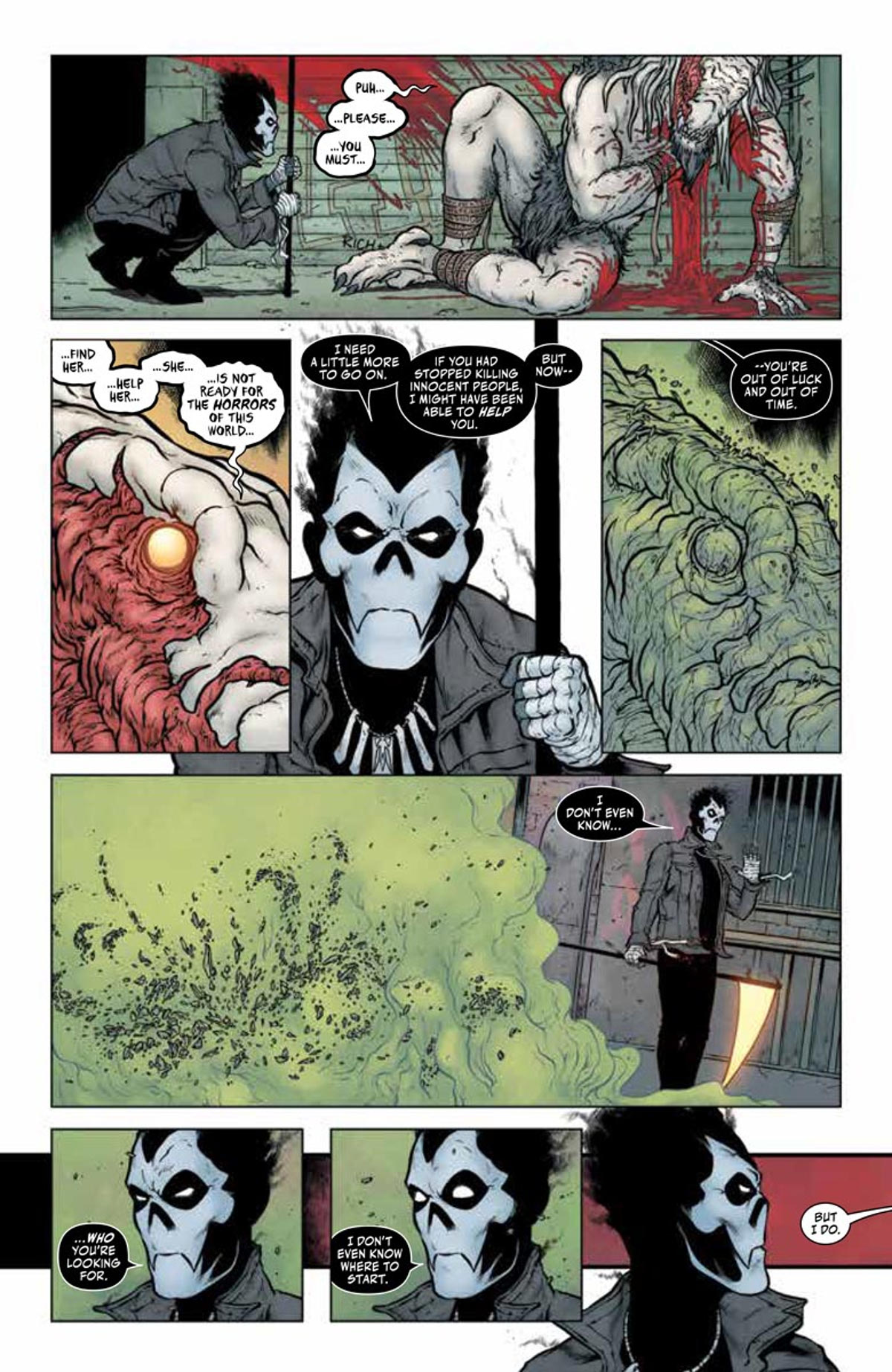 What truly makes this comic stand out is the artwork. Those who are familiar with Jon Davis-Hunt’s work on previous horror series (such as the all-too-brief Clean Room) won’t be surprised to find him in fine form here. Few artists showcase the skill Davis-Hunt does in depicting vivid details with intricate line-work and thick inks without drowning their pages in darkness and obscuring the fine points of their artwork. It helps that Jordie Bellaire’s color art adds the perfect highlights to Davis-Hunt’s work, so that the full frightful spectacle of the story is clearly depicted. The lettering by Clayton Cowles is also top-notch, with Jack’s narration and dialogue both clearly differentiated with unique balloon styles and coloring.