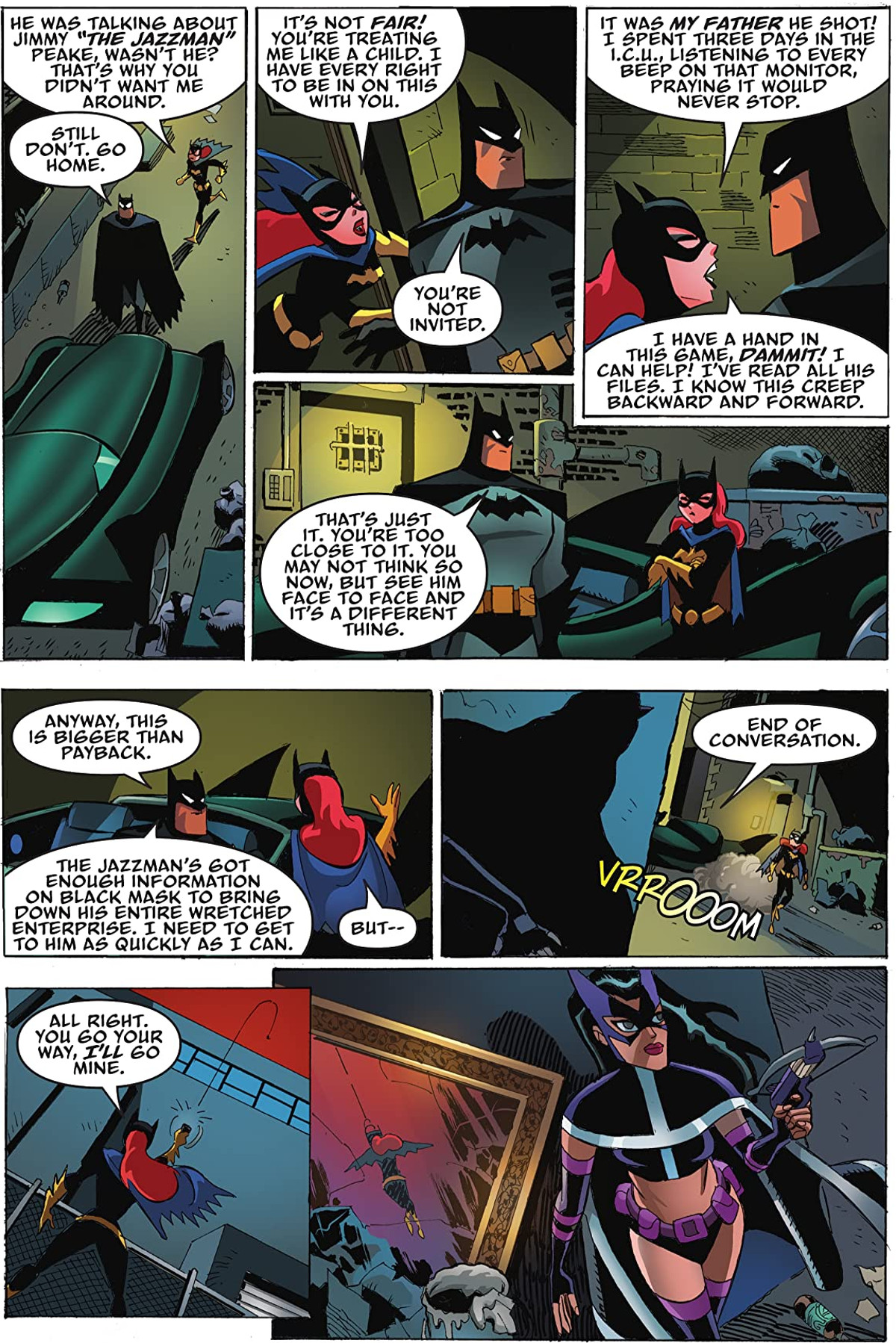 The action centers around Batgirl, who goes off on a search for escaped gangster Jimmy “The Jazzman” Peake, who once nearly murdered her father, Commissioner Gordon, in the classic Batman: The Animated Series episode “I Am The Night.” She unwittingly becomes his protector, however, when it turns out that the Huntress is also on the prowl and looking for the Jazzman, who was one of the men responsible for the death of her family. It’s a classic setup from Paul Dini and Alan Burnett, but an effective one. The real draw here is the interactions between Batgirl and Huntress and getting to see more of the Jazzman, who was one of the more engaging mobster villains in the Animated Series and one who warranted further development. That being said, while I’m sure most of the audience of this book are adults, it was still odd to see Batgirl cursing in this book, given the source material was originally aimed at family audiences.