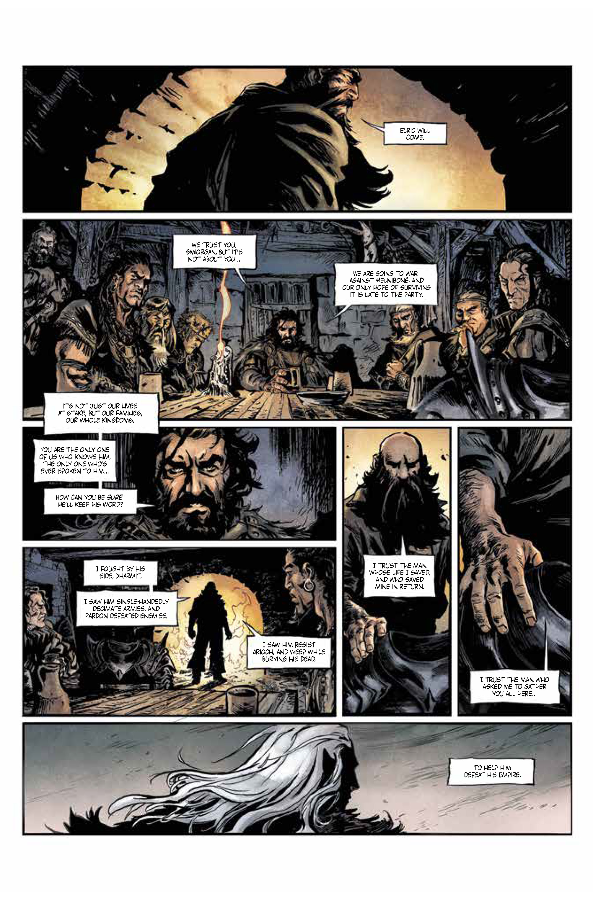 The artwork by Julien Telo is intricate. While the world of Elric is a grim and gritty place, Telo’s artwork avoids becoming cluttered or busy as he depicts the filthy and decay of the environment. Stephanie Paitreau’s colors add to this aura, with a washed-out palette symbolizing the fading glory of the lost empire and Elric’s weakening resolve.