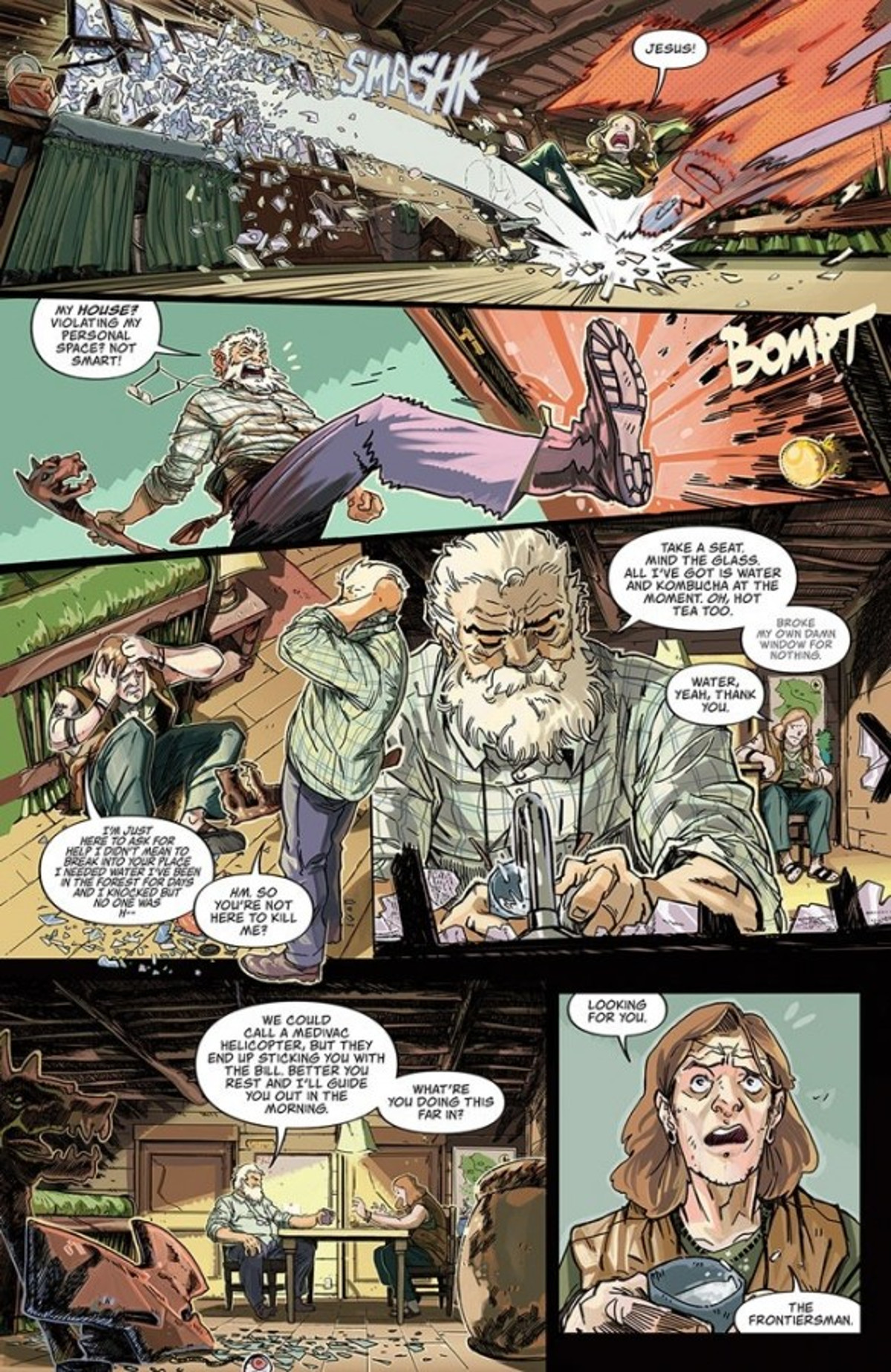 Frontiersman #1 doesn’t hide its inspirations, nor does it apologize for its politics or being ready to fight for them. This is not a book for anyone who complains unironically about big publishers going broke by being woke or politics in their superhero stories. Patrick Kindlon’s script immediately establishes the Frontiersman as a likeable old cuss who wonders whether the old dog can still learn some new tricks. The artwork by Marco Ferrari perfectly captures the beauty of the Pacific Northwest and draws the reader deeper into the story with every passing panel.