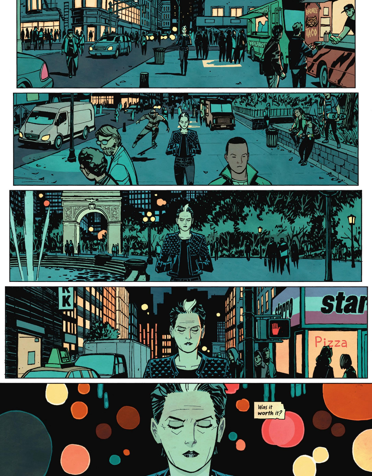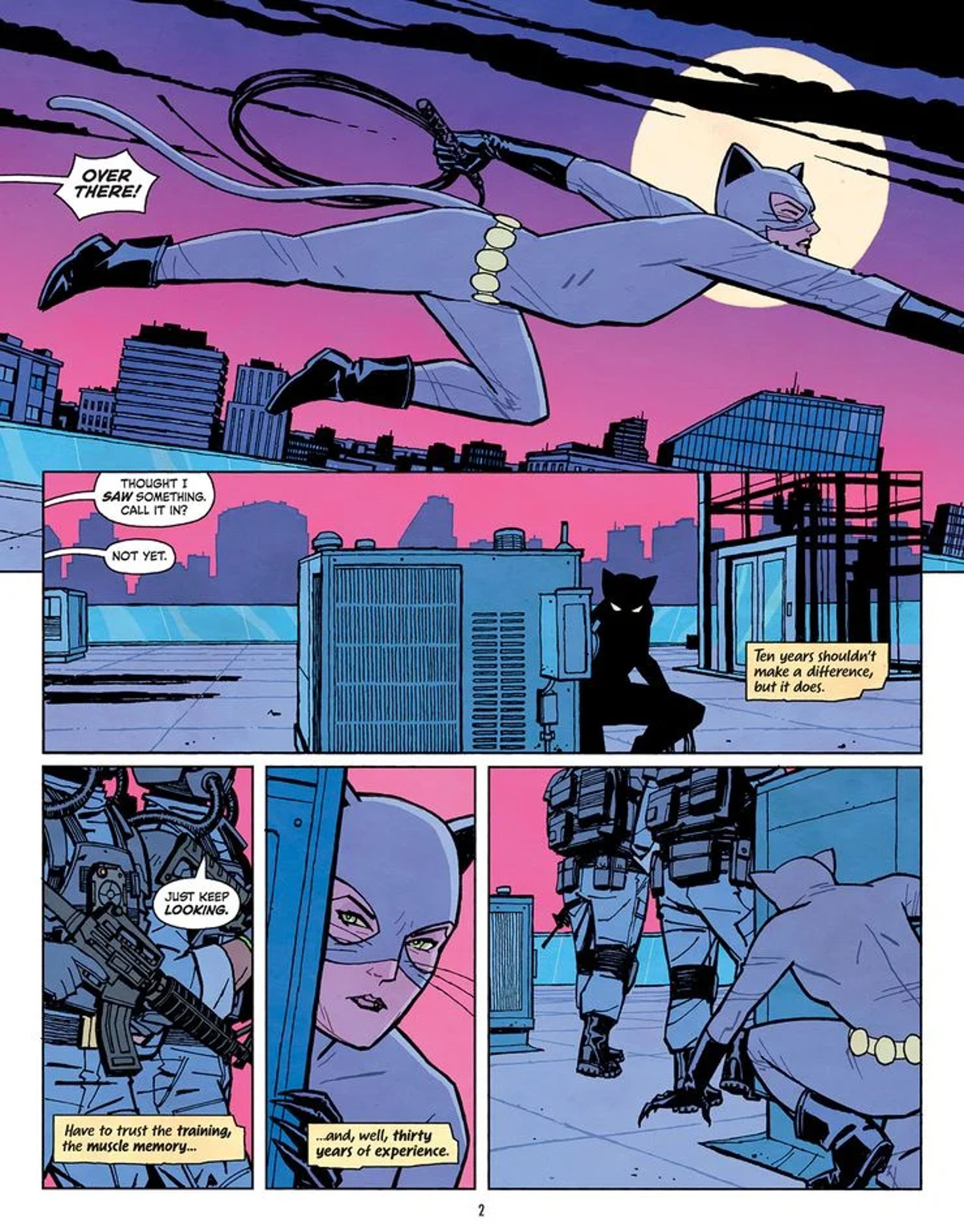 The aesthetic of the book is close to the Darwyn Cooke and Ed Brubaker Catwoman series, which was reportedly a source of inspiration to Chiang. The influence is clear, with Chiang’s art boasting bold coloration and smooth, streamlined designs that are reminiscent of Cooke’s work. The final product, however, is all uniquely Chiang’s.