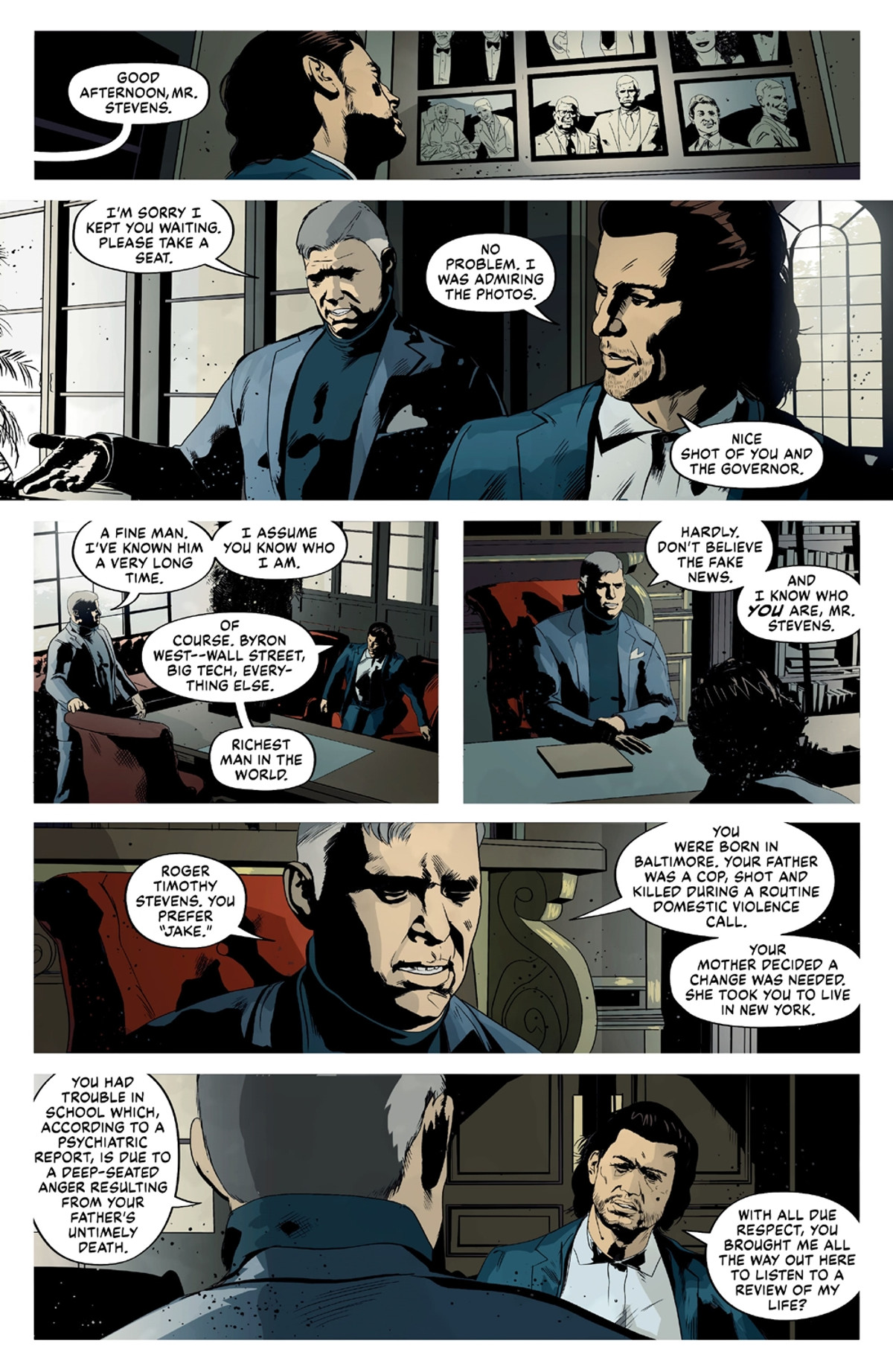 Many comic book writers have tried to tell stories of Batman with the serial numbers filed off before. Sadly, Cloaked does little to distinguish itself from what has come before. Writer Mike Richardson has the rhythm of a good noir story down pat. Unfortunately, the characters are stock cardboard cutouts and Richardson doesn’t bother to creatively introduce us to the cast. Our introduction to Roger “Jake” Stevens comes through a biography read aloud by his client – a cliché that even Stevens can’t believe.