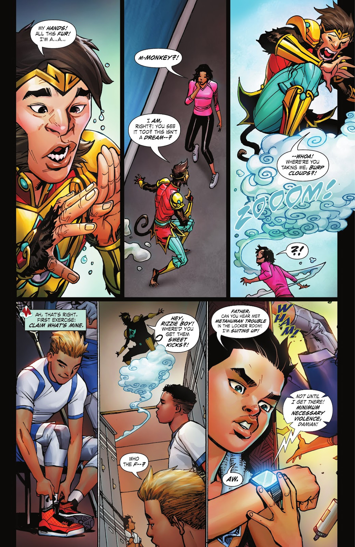 Gene Leun Yang’s script draws equally upon Journey to the West and classic superhero tropes. Marcus is quickly established as a sympathetic proxy for the reader in the same mold as Peter Parker and Percy Jackson, being an unathletic nerd who is bullied even before he begins manifesting strange clouds and grows a tail. This foreshadows the reveal that he is the son of the Monkey King and privy to fantastic powers. Unfortunately, his first effort at using those powers against his bullies brings unwanted attention…