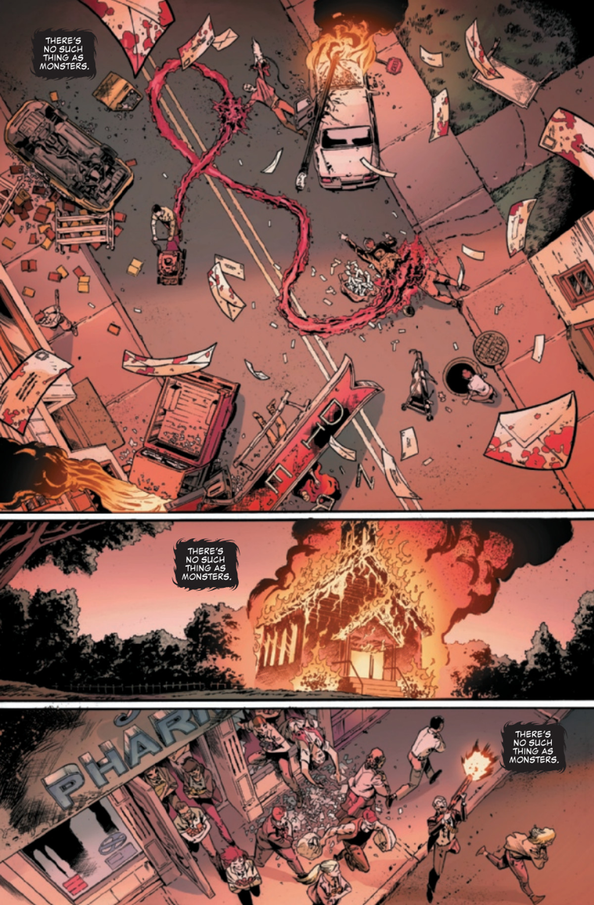 Cory Smith’s artwork suits the story, being heavily detailed and even more heavily shaded. There is a sinister undercurrent to the artwork, even in the mundane suburban scenes at the start of the story. Smith shines in the later portions when the demons emerge and the color art by Bryan Valenza increases the aura of terror with a subtle red-shift of the tints.