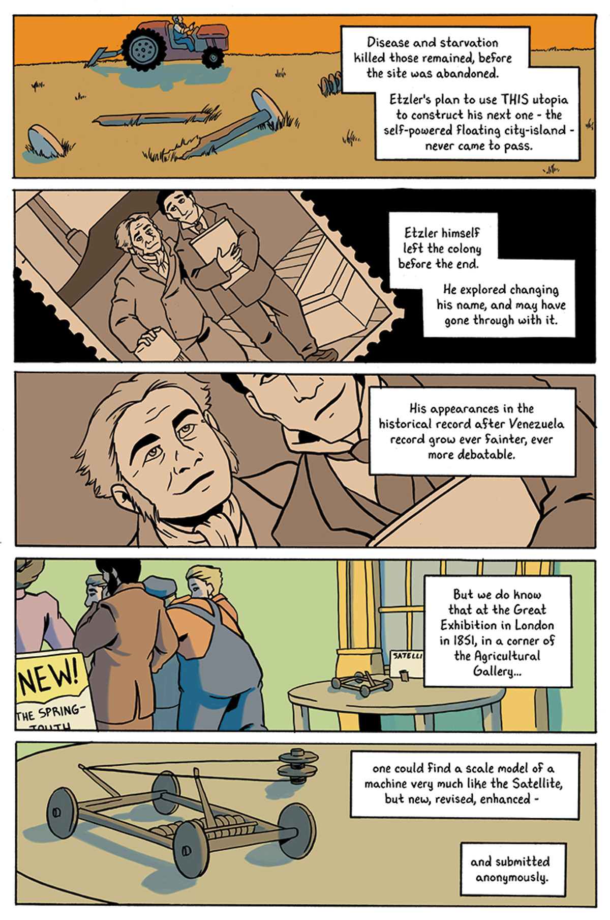 What follows are six pages from one story, “The Paradise Within The Reach Of All Men,” with script by Ryan North and art by Kel McDonald. It details the rather sordid career of inventor John Etzler, whose plan to build a mechanized, workerless city ended with him fleeing the country and disappearing after a Royal Inquiry determined that his Etzer’s city was “no utopia; it was a cold-blooded system for murder.”