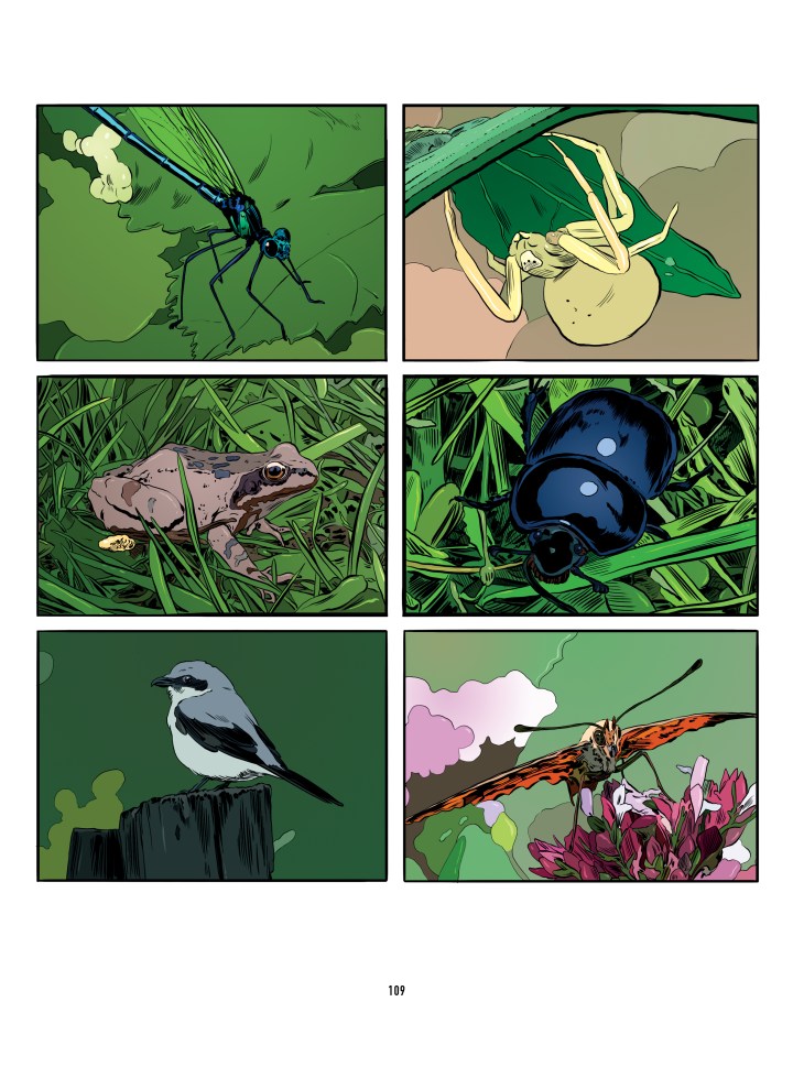 The artwork is similarly understated, yet capable of delivering powerful ideas with surprising subtlety. Indeed, the mundanity of Yves’ life is underscored by the suddenly vibrant colors of the natural world amid the dull greys and pastels that define the modern world. Even the blue of the sky above seems a relief from the technological terrors of this dystopia. The sum total is a visual masterpiece.